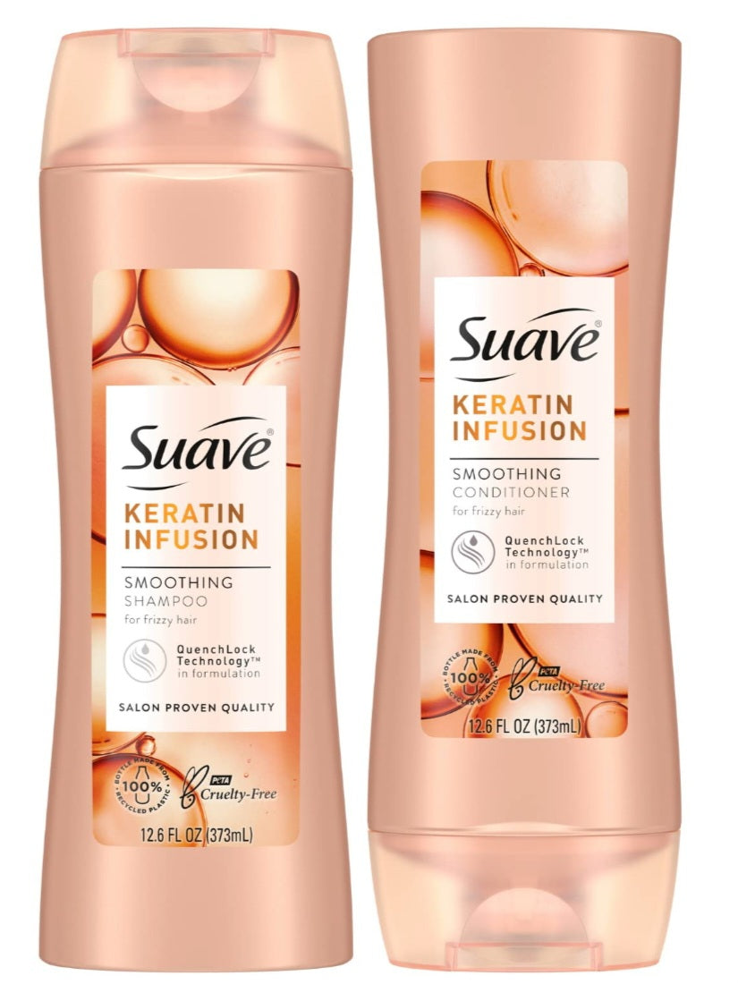 Suave keratin infusion shampoo and condioneeTransform your frizzy hair with Suave keratin infusion smoothing shampoo and conditioner. Wet hair, massage into scalp, and rinse for salon-quality results. Tame your locks and enjoy smooth, frizz-free hair all day long with this proven formula. Give your hair the love it deserves with Suave.